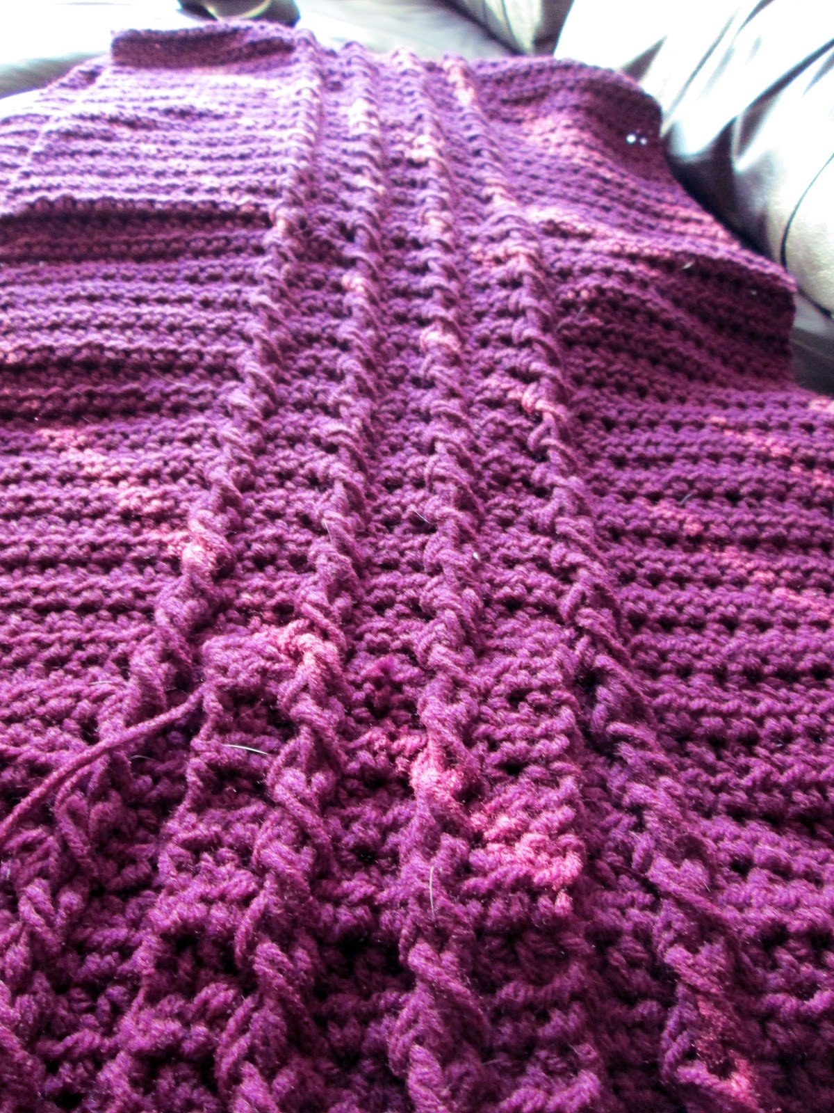 One of my current favorite projects is this crochet wrap by Kimberly McAlindin. I picked up a pound of this beautiful deep magenta color yarn which I thought would look fabulous for this pattern. The pattern is super easy once you get it figured out. The author has some youtube videos up that explain the entire pattern for you in case you get stuck (which I watched and thought were SUPER helpful). Sadly, I ran out of yarn with about 40 more rows to go, so my wrap is not yet complete. Hopefully I can run out and get some more yarn soon so that I can finish it...I can't wait to see how it looks on.